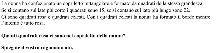 - Capire che il numero totale dei quadretti della coperta è dato da 22 x 15 = 330 (ci sono 15 strisce, ciascuna con 22 quadretti) mentre il numero totale dei quadretti celesti è dato da: (22 x 2) + (15 x 2) - 4 = 70 (non si devono considerare due volte i quadretti nell’intersezione delle strisce). Ne segue che il totale dei quadretti rosa è 330 - 70 = 260; o anche fare direttamente 13 x 20.