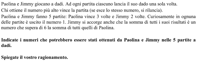 - Comprendere, secondo le tre indicazioni del problema (3 partite vinte da Paolina, 2 da Jimmy e lo scarto di 6 punti tra i totali) che la vincita di ciascuna partita si ottiene per confronto diretto dei due numeri corrispondenti ai punti ottenuti, ma che bisogna conservare memoria di ciascuna partita (i punti di ciascuno o almeno gli scarti di ciascuna partita) per determinare lo scarto totale sulle cinque partite, per addizione e sottrazione.