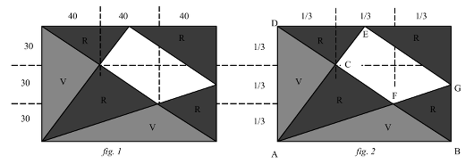 - Redessinez exactement la bannière, à l’échelle, par un rectangle partagé par des segments, puis mesurer les dimensions et effectuer les calculs correspondants, numériquement, avec des mesures approximatives relevées sur la construction (fig. 1) sans avoir conscience que « 30 » et « 40 » sont les tiers respectifs de « 90 » et « 120 » ;