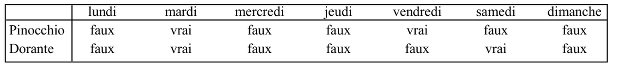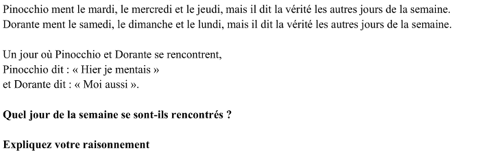 Déterminer quel jours Pinocchio et Dorante se sont rencontrés sachant que Pincchio ment le mardi, le mercredi et le jeudi, que Dorante ment le samedi, le dimanche et le lundi, qu'ils disent la vérité les autres jours et que Pinocchio dit : « Hier je mentais »