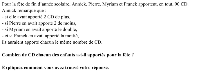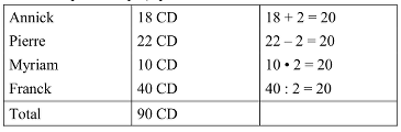 ou tenter d’exprimer le nombre de CD des quatre amis en fonction du nombre des CD de l’un d’entre eux ou mettre en procédant par voie algébrique :