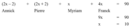 Décomposer 90 en quatre termes a, b, c, d sachant que a+2 = b-2 = 2 x c = d/2.