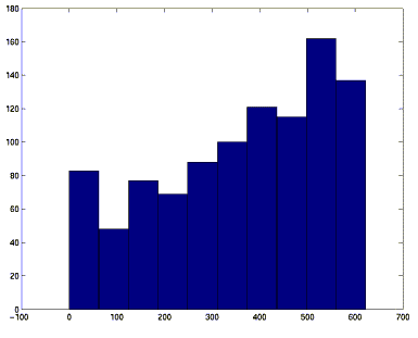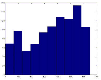 une loi puissance (de type Dans ce document, on commence par faire quelques hypothèses théoriques suivies de simulations et de recherche de structure selon les procédés décrits dans [5]. HypothèsesL'hypothèse principale est que le nombre de descripteurs et les descripteurs eux-mêmes sont attribués au hasard (de façon uniforme) à l'intérieur de chaque unité d'information. Et qu'il en va de même pour les référents. A ce procédé répond donc un graphe "isotrope". C'est-à-dire que la probabilité qu'un lien existe entre deux sommets x et y est une constante. Cette propriété d'isotropie entraîne que la répartition des Ui en fonction du nombre de liens "rentrants" ou "sortants" suit une loi binomiale (annexe 1). Il est évident que le paramètre de ces distributions va dépendre de la densité des descripteurs et référents pour chaque Ui. Par contre, la façon dont cette densité intervient est plus difficile à estimer. L'annexe 2 en propose une estimation. On peut également prévoir que ces hypertextes vont possèder un assez haut degré de connectivité. Il est également prévisible que des quasi-composantes connexes vont faire leur apparition si la distribution des concepts dans les unités d'informations ne se fait plus de façon de façon uniforme (c'est-à-dire si certains concepts ont des liens privilégiés avec certaines Ui). L'influence de cette distribution sur la connectivité de l'hypertexte est également difficile à prévoir. Une étude expérimentale est faire à ce propos dans un autres documents. Les exemples à distribution uniformeTrois exemples sont traités qui suivent la même procédure. Il varient par le nombre total de concepts et le nombre maximum de descripteurs / référents par Ui. Les manipulations pour décrire la structure sont décrite dans [5]. Exemple 1000 - 100 (10, 20)Le premier hypertexte généré contient 1000 documents et 100 concepts avec au maximum 10 descripteurs et 20 référents par document. Le nombre de descripteurs et de référents associes à une Ui est pris au hasard selon une distribution uniforme. Concrètement la matrice des descripteurs D et celle des référents sont créées par: D = new_docXmot(1000,100,10) R = new_docXmot(1000,100,20) La matrice du graphe est donnée par : G = R*D'. Puis le graphe est rendu univalué (G = G&G). Dans le cas particulier, le graphe obtenu a 1000 sommets et 361014 arêtes. Les figures 3 et 4 montrent la distribution des liens "sur" et "à partir de" (techniquement rendu par hist(sum(G,1)) et hist(sum(G,2)). fig 3. Distribution du nombre de liens sur les Ui fig 4. Distribution du nombre de liens à partir des Ui L'annexe 1 montre que ces distributions suivent une loi binomiale. L'annexe 2 en estime les paramètres. Connexité du graphe non orientéOn symétrise et univalue G (Gx = G+G', puis par Gx&Gx). En cherchant la multiplicité de la valeur propre 0 du laplacien combinatoire (diag(sum(Gx,2)) - Gx) on obtient le nombre de composantes connexes. En l'occurence ce nombre est 2. L'examen du vecteur propre correspondant montre qu'un des composantes se réduit à une unité d'information (u994). La première valeur propre non nulle est 40 ce qui est l'indice d'une connectivité élevée pour les 999 sommets restants (il faut ôter au moins 40 sommets pour décomposer le graphe en deux composantes). Autorités et hubsLa recherche des valeurs propres de GG1 = G*G' donne comme valeur maximum 201130. Le vecteur associé à cette valeur maximum (dans ss1.txt) a (environ) 40 composantes nulles (puits). Les autres composantes varient entre 0.0031824 et 0.047603. Sans vraiment mettre en évidence des hubs, ce qui correspond bien à la figure 4. Le même travail avec G1G = G'*G conduit à un vecteur propre associé (dans s1s.txt) avec 69 valeurs nulles (sources). Les autres composantes varient entre 0.0066216 et 0.049631. Structure papillonLe but est de chercher le CORE de l'hypertexte construit. La procédure est la suivante: