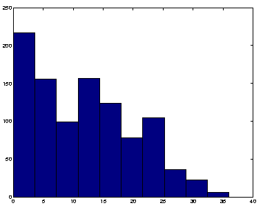 RemarquePar rapport au cas précédent on note la forte diminution du maximum de liens entrants/sortants (moins de 10 Ui ont plus de 100 de ces liens). La connectivité a également fortement diminué mais le CORE est encore constitué de 93% des Ui. Exemple 1000 - 1000 (5, 10)Le dernier exemple traité va également contenir 1000 documents et 1000 concepts avec au maximum 5 descripteurs et 10 référents par document. L'hypertexte est obtenu selon la même procédure que précédemment. Le graphe associé contient 1000 sommets et 11682 arêtes Les distributions des descripteurs et référents sont donnés dans les figures 7 et 8. fig 7. Distribution du nombre de liens sur des Ui fig 8. Distribution du nombre de liens à partir des Ui Connexité du graphe non orientéSelon la même procédure que précédemment, on symétrise et univalue G (Gx = G+G', puis par Gx&Gx). La multiplicité de la valeur propre 0 du laplacien combinatoire est 21 ce qui donne le nombre de composante connexe. L'examen des vecteurs (dans v21.txt) propres correspondants montre que 20 des composantes se réduisent à une unité d'information. La première valeur propre non nulle est 0.967 ce qui est l'indice d'une connectivité basse. Pour des études ultérieures, le vecteur propre correspondant à cette valeur propre se trouve dans vp22.txt. Autorités et hubsLa reherche des valeurs propres de GG1 = G*G' donne comme valeur maximum 332. Le vecteur associé a cette valeur maximum des composantes variant entre 0 et 0.0868. Structure papillonLe but est de chercher le CORE de l'hypertexte construit. La procédure est la même que précédemment et fourni un CORE de 772 éléments. RemarqueLa diminution de la connectivité est à nouveau compréhensible. Même le CORE n'est plus constitué que de 77% des Ui. Toutefois, on notera que les composantes connexes sont outre la plus grande, constituée d'une seule Ui. ConclusionL'expérimentation correspond aux projections théoriques. La construction à partir des descripteurs et des référents conduisent à des structures simples. Les graphes sont relativement bien connectés. Notes[1] Voir le document: Définition formelle d'un hypertexte et calcul de coefficients locaux. [2] Barabasi, A.-L. (2002). Linked, The New Science of Networks. Cambridge, MA : Perseus Publishing. [3] Un simulateur pour la création d'hypertextes. [4] Quelle équivalence entre ces deux caractéristiques ? Trois structures principales sont proposées pour les réseaux: centralisée (l'étoile), décentralisée (hiérarchie d'étoiles), distribuée. A noter que Internet conçu selon l'architecture distribuée a évolué vers une structure décentralisée. [5] Voir documents: Quelques manipulations pour déterminer la structure d'un hypertexte et Etude expérimentale de la structure d'un hypertexte obtenu par agrégation. [6] Pour 6 unités d'information on obtient la valeur de 959, ce qui est impossible (les deux "CORES" auraient une Ui en commun et donc sont égaux). Ce résultat est dû au problème de l'identification de très petites valeurs à la valeur 0. Annexe 1: distribution théorique du nombre de liens sur une Ui pour les hypertextes créés à partir des relations documents-concepts Si n est le nombre d'unités d'information et si Annexe 2: calcul du paramètre Notation :