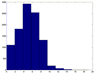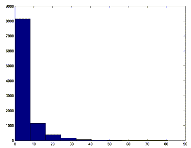 La matrice uis contient l'ensemble des unités d'information (une par ligne), les colonnes donnant le numéro, le degré de fitness, le nombre de liens et le type. Les liens sont fabriqués selon un coefficient d'attirance qui dépend des types respectifs de la source et de la cible, du degré de fitness de la cible et du nombre de liens de la cible. r est la matrice d'adjacence. rij = 1 signifie qu'il y a un lien de l'unité d'information i vers l'unité d'information j. ExempleLa commande load simul initialise les variables (y compris 2 unités d'information). Le commande agreg(9998,100) ajoute 9998 unités d'information, puis elle "choisit" 100 unités d'information à partir desquelles des liens sont établis selon le même algorithme que précédemment. La figure 1 représente la distribution des liens sur une unité d'information (Ui). La figure 2 représente la distribution des liens à partir des unités d'information. fig 1. Distribution du nombre de liens sur les Ui fig 2. Distribution du nombre de liens à partir des UI La première distribution suit une loi de courbe en L. Il met