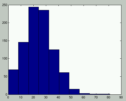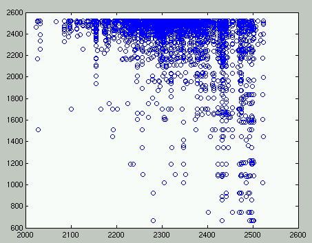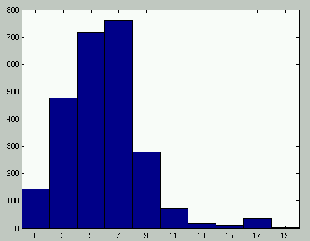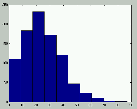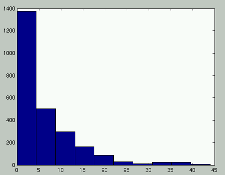 IntroductionDans ce document, il est rendu compte de la structure du graphe des concepts associés à un hypertexte. Le premier exemple concerne un hypertexte obtenu par R et D (hptxt1000-900c). Le deuxième est construit par agrégation à partir de 2 germes (simul2g-500-100). Premier hypertexteLa matrice du graphe est obtenue par: G = D'* R. La figure 1 représente la distribution du nombre de concepts conduisant à un concept donné (concept "sur", hist(sum(G,1)). La figure 2 donne la distribution des concepts "sortants". Le CORE (unique) est consitué de 874 concepts (sur un total de 900). fig 1. Distribution des concepts "sur". fig 2. Distribution des concepts "de". On constate que ces distributions s'apparentent à celles obtenues sur la graphe des unités d'information. La deuxième étude utilise la technique introduite dans le document Structure d'un hypertexte sous forme matricielle. La figure 3 introduit une coupure de valeur 0.01. fig 3. Représentation des concepts de l'hypertexte: hptxt1000-900c. Valeur de coupure 0.01 Les concepts à droite sont les concepts "puit" c'est-à-dire terminaux ou primitifs, il ne font appel à aucun n'autres. Les concepts en haut sont les concepts "source", c'est-à-dire qui ne sont jamais utilisés par d'autres. Les concepts proches de l'origine sont des concepts "hubs". Deuxième hypertexteLe deuxième hypertexte est obtenu par agrégation. Il contient 2524 arêtes qui deviendront dans la construction R - D des concepts. Les distributions "sur" et "de" sont données par les figures 5 et 6. A nouveau, les distributions sont apparentées à ces des liens entre Ui. fig 4. Distribution des concepts "sur". fig 5. Distribution des concepts "de". La figure 6, représente les concepts dans le plan donné par leur coordonnées "sur" et "de". Pour des problèmes de calcul, on s'est limité à une approximation de la fermeture à distance 3 (ST = 1 + GBAR + GBAR^2 + GBAR ^3 coupure a 0.001) fig 6. Représentation des concepts de l'hypertexte: simul2g-500-100. On notera que #K3(c) = 1 pour environ 1000 concepts c. La valeur maximum est de 173. Elle ne dépasse 100 que pour 17 concepts. |
