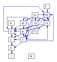 La matrice uis contient l'ensemble des unités d'information (une par ligne), les colonnes donnant le numéro, le degré de fitness, le nombre de liens et le type. Les liens sont fabriqués selon un coefficient d'attirance qui dépend des types respectifs de la source et de la cible, du degré de fitness de la cible et du nombre de liens de la cible. r est la matrice d'adjacence. rij = 1 signifie qu'il y a un lien de l'unité d'information i vers l'unité d'information j. Exemple techniqueLa commande load simul initialise les variables (y compris 2 unités d'information). Le commande agreg(13,5) ajoute 13 unités d'information, puis elle choisit 5 unités d'information à partir desquelles des liens sont établis selon le même algorithme que précédemment, La matrice obtenue est: 1 2 3 4 5 6 7 8 9 10 11 12 13 14 15 r = 1 0 0 0 0 0 0 0 0 0 0 0 0 0 0 0 2 1 0 0 0 0 0 0 0 0 0 0 0 0 0 0 3 0 0 0 0 0 0 0 0 0 0 0 0 0 0 1 4 0 1 0 0 0 0 0 0 0 0 0 0 0 0 0 5 0 0 0 1 0 0 0 0 0 0 0 0 0 0 1 6 0 0 0 1 1 0 0 0 0 0 0 0 0 0 0 7 0 1 0 1 1 1 0 0 0 0 0 0 1 0 1 8 0 0 0 0 1 0 0 0 0 0 0 0 0 0 0 9 0 0 0 0 0 0 0 0 0 0 0 0 0 0 0 10 0 0 0 0 1 1 1 0 0 0 0 0 0 0 0 11 0 0 0 0 0 0 0 0 0 0 0 0 0 0 0 12 0 0 0 0 1 1 1 0 0 0 0 0 0 0 0 13 0 0 0 0 1 1 0 0 0 1 1 0 0 0 1 14 0 0 0 0 0 0 1 0 0 1 0 1 1 0 1 15 0 0 0 0 0 0 1 0 0 0 0 1 1 0 0 La commande tri_r permet d'obtenir une statistique. Pour chaque unité d'information on calcule l'ordre du sommet, le nombre de liens entrants (descripteurs) et le nombre de liens sortants (référents). UI ordre nb de nb de descr. réf. 7 10 4 6 5 8 6 2 15 8 5 3 13 8 3 5 6 6 4 2 12 5 2 3 10 5 2 3 14 5 0 5 4 4 3 1 2 3 2 1 11 1 1 0 1 1 1 0 8 1 0 1 3 1 0 1 9 0 0 0 66 33 33 On voit que les unités 7, 5, 15 et 13 constituent des unités centrales. Les unités 14, 8, 3 n'ont pas de liens entrants (ce sont des sources), les unité 1 et 11 sont au contraire des puits (pas de liens sortants). L'unité 9 est isolée.