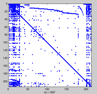 Ces données sont enregistrées dans 2 matrices, R et D à partir desquelles vont s'effectuer les calculs en particulier la matrice de structure S. Cas 1 (trunc = 1, coup = 0.01)Cette analyse se fait à partir de la matrice ST, matrice S tronquée à 0.01 puis dichotomisée. Les points sont organisés de gauche à droite et de bas en haut. Dans la table on note la zone, une brève description et la liste des unités avec leur numéro, leur nom et parfois leurs coordonnées (parenthèses en italique). Pour information la 'spy' de la matrice ST est :